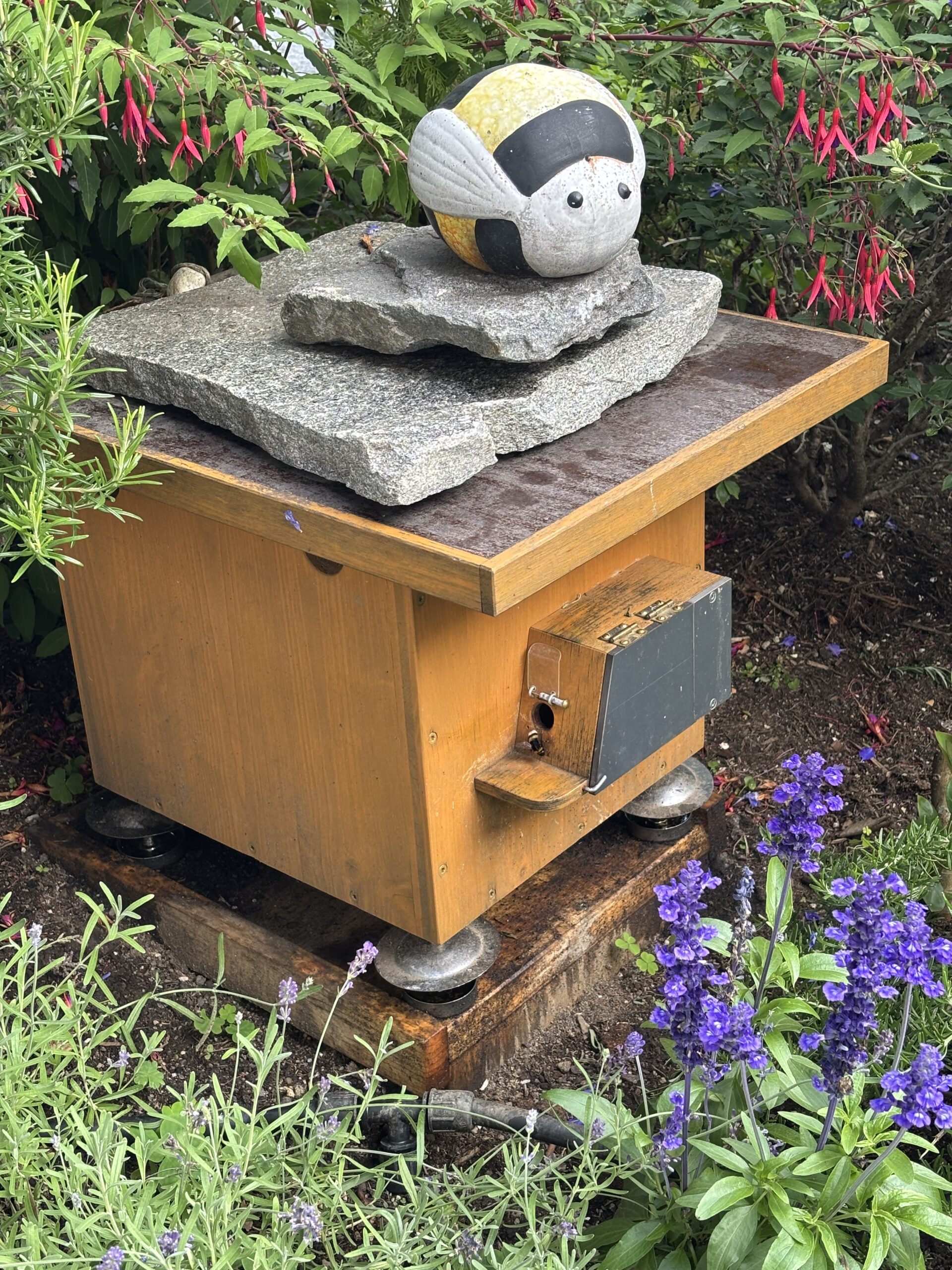 In 2025 habe ich bei den Erdhummeln einen nächsten Level erreicht. Im zeitigen Frühjahr schwirrten plötzlich mehrere Königinnen gleichzeitig im Garten umher. Dann kam es noch besser. Schnurstracks im Direktflug durch das seitliche Flugloch ins Hummelhaus.