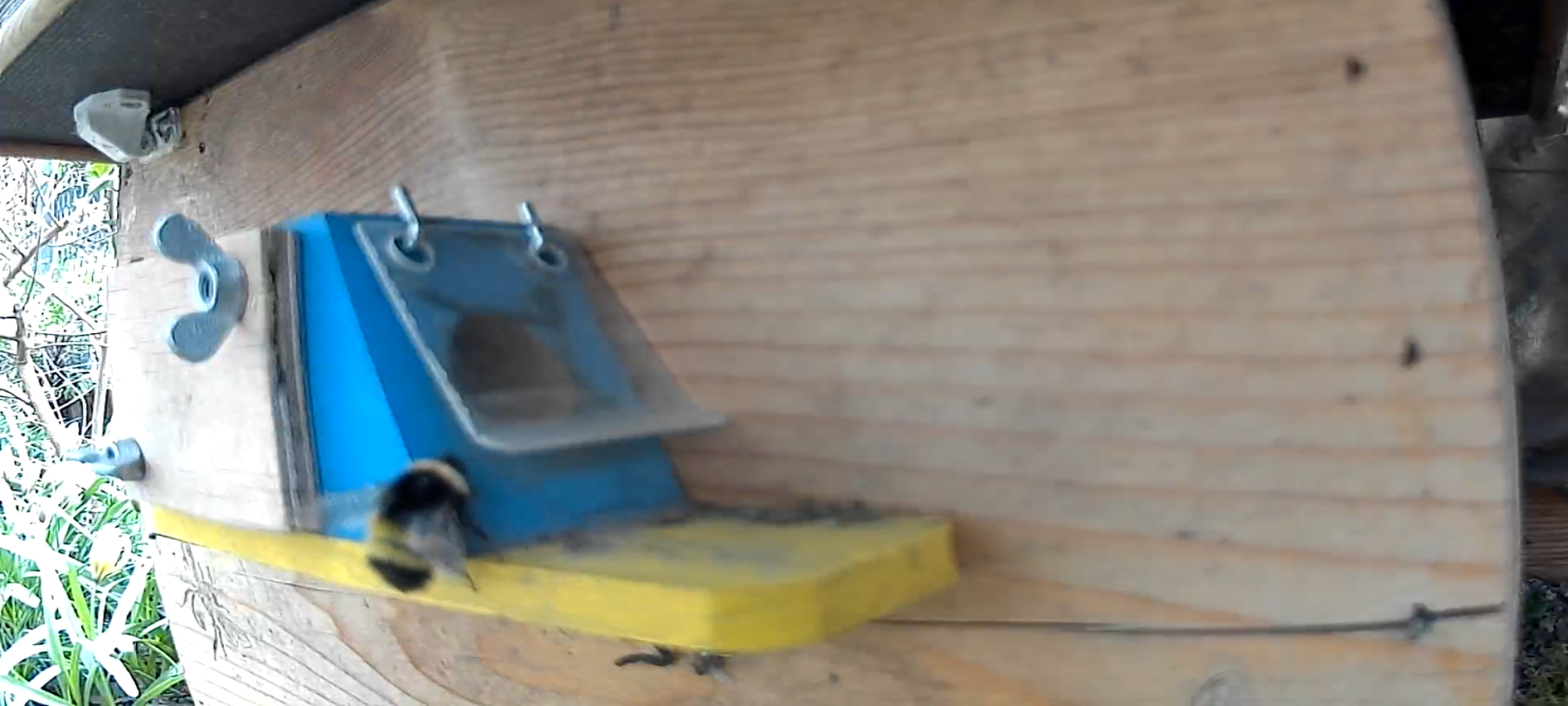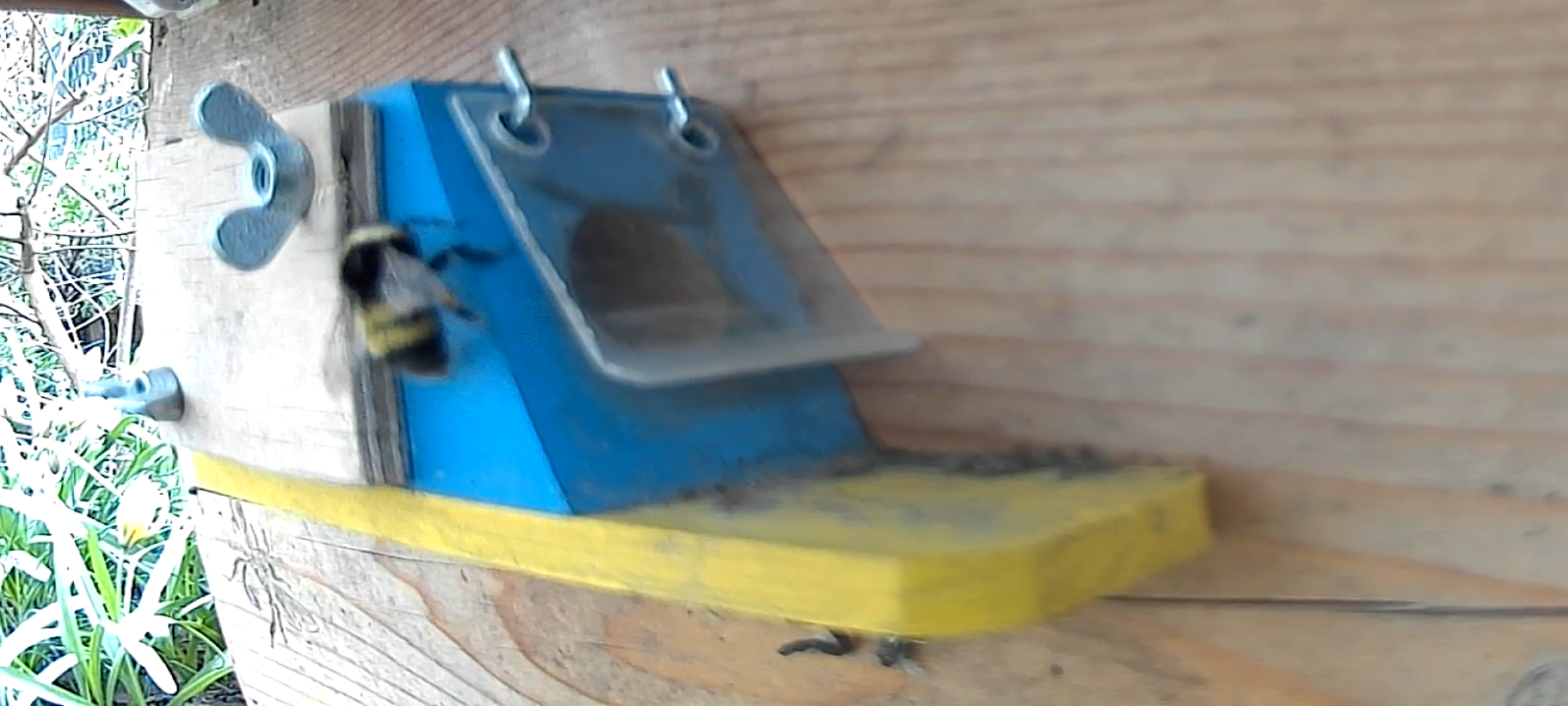 Die Ansiedlung in den beiden noch leeren Kästen gestaltet sich etwas schwierig, vermutlich weil hier noch nichts nach Hummel riecht. Die Innenkästen (aus Holz) sind noch frisch und waren noch nie bewohnt, also noch kein Hummelduft.