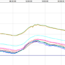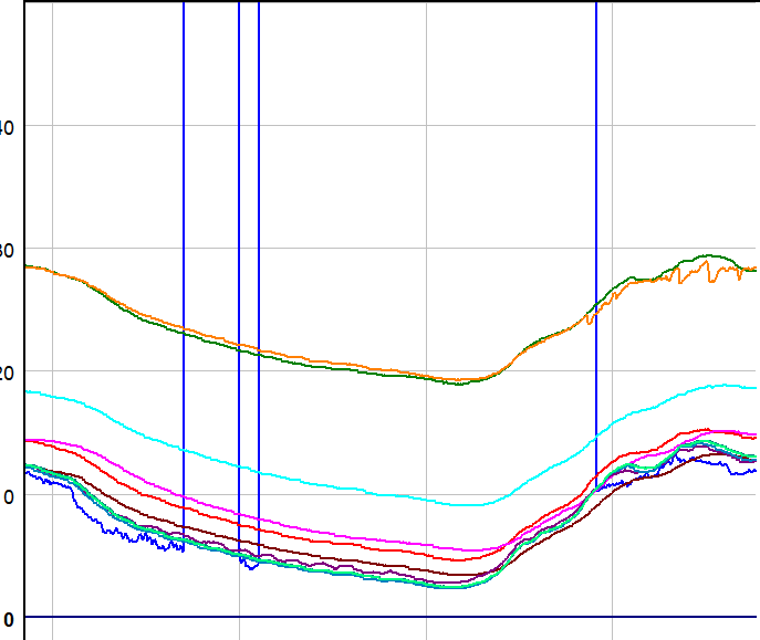 Gestern haben wir nach dem Mittagessen die alte Festplatte des Rekorders ersetzt. Da waren die Kameras ausgeschalten, was krass auffällt. Ebenso fällt die Kurve der dritten (ältesten) Kamera auf. Die scheint weniger Wärme abzugeben. Die Temperatur allgemein in den Kisten wird durch die IR LEDs wohl nicht gross erhöht.