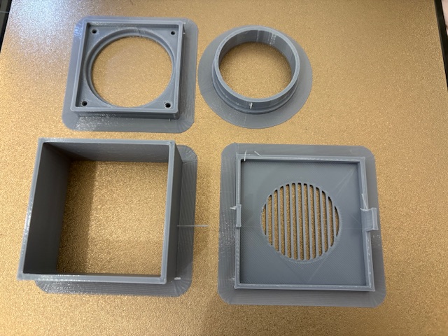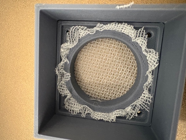 Zum einen ist da ein Rahmen der mit 4 Schrauben über dem Lüftungsloch befestigt wird. Zum Zentrieren kann  man das Rund Teil bentzen das später die hintere Gaze zum Kasten hält. Darauf wird der quadratische Kasten geschoben der später mit dem Klebeband innen ausgekleidet wird und darauf wird der Deckel mit den Lüftungsschlitzen geschoben. Zwischen Kasten und Deckel auch noch einmal eine Lage Gaze.