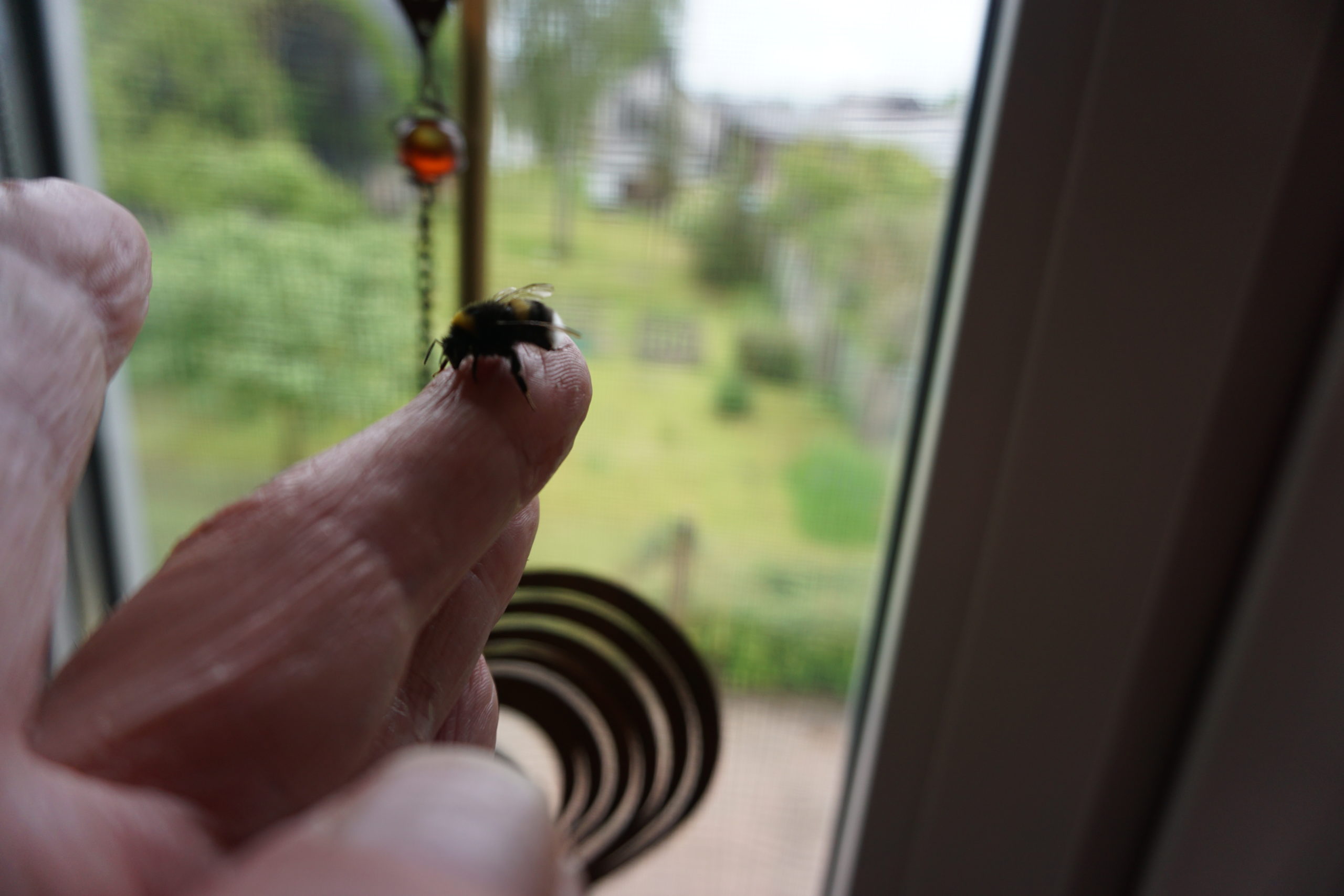 Das auf Deinem Finger dürfte eine Erdhummelarbeiterin sein. Auf dem Gänseblümchen sitzt ein Käfer. Und an Deinem Wildbienenhotel ist ja ganz schön was los.