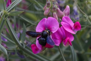 Die Blaue Holzbiene (Xylocopa violacea) ist die größte heimische Wildbienenart und gehört zu den Solitärbienen und steht unter Naturschutz. Sie wird oft für eine Hummel gehalten, weil sie so groß ist (bis zu drei Zentimeter). Man erkennt sie gut an ihren blau schimmernden Flügeln und dem metallisch schwarz glänzendem Körper. Alle Holzbienen-Arten haben auf der Brust und am Hinterleib gelbe Haare. Hie Holzbiene hat zwar einen Stachel, ist aber sehr friedlich.