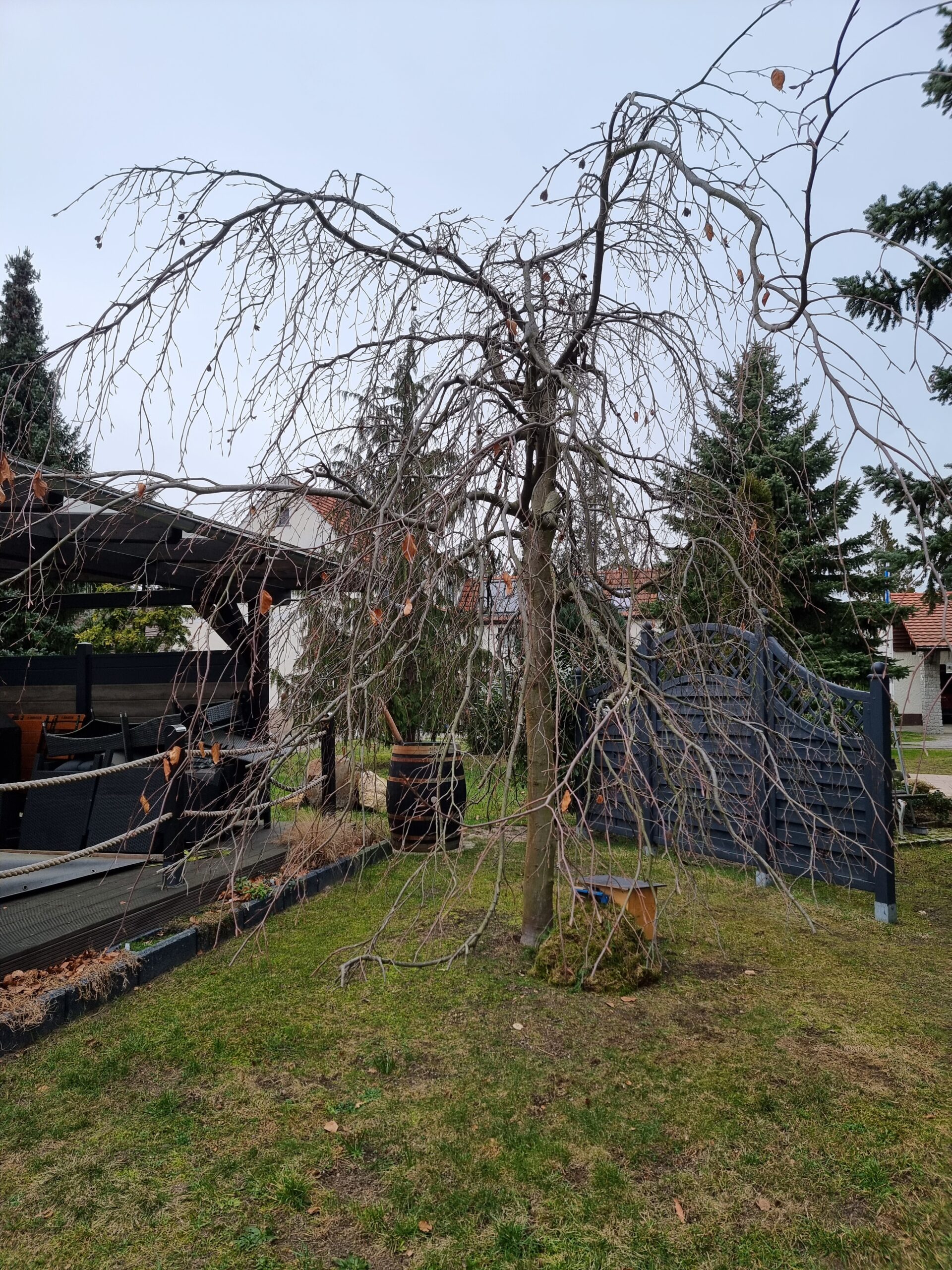 Das Haus, mit Öffnung nach Polen (Osten), steht unter einer großen Rotbuche, welche im Sommer völlig belaubt ist und absolut keine Sonne durch lässt… ;)