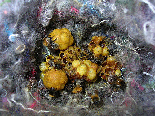 Das frisch gegründete Wiesenhummelnest durch die sehr späte Königin im Ackerhummelkasten ist leider verwaist. Dafür haben sich die Ackerhummeln gut entwickelt. Ca. 15 Tiere gehören dem Nest an. Hier mal ein Foto vom Nest: