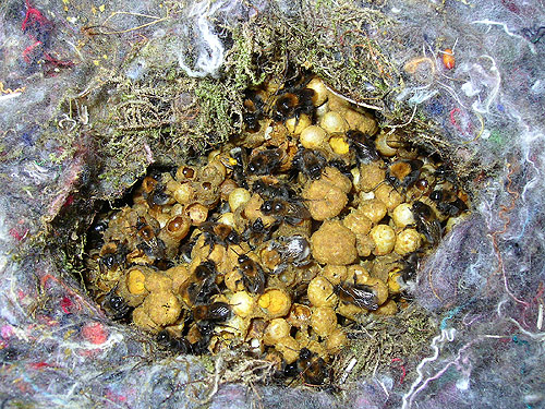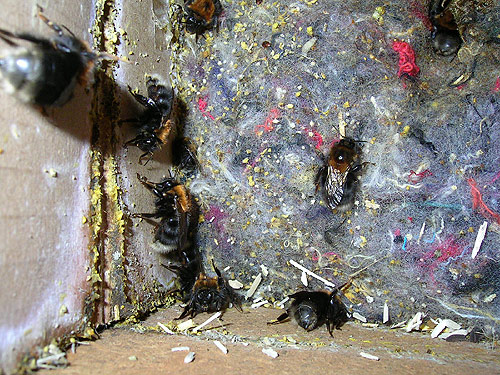 Die Baumhummeln haben sich prächtig entwickelt. 200-220 Individuen gehören dem Nest an, welches mittlerweile fast den halben Kasten komplett ausfüllt. Die ersten Geschlechtstiere sind unterwegs, große Jungköniginnen fliegen bereits aus. Sowieso erinnert die Flugfrequenz eher an Wespen als an Hummeln, zumindest gibt es ständig An- und Abflüge. Die Nahrungssituation in diesem Nest ist hervorragend, die sanitäre Situation im Kasten nicht ganz so gut, da die ganzen Tiere auch allerhand Dreck produzieren. Obwohl gelegentlich Larven aus dem Nest geworfen werden, gibt es zahlreiche Eier, Larven und Puppen jeglichen Entwicklungsstandes im Nest. Folgend 2 Bilder: