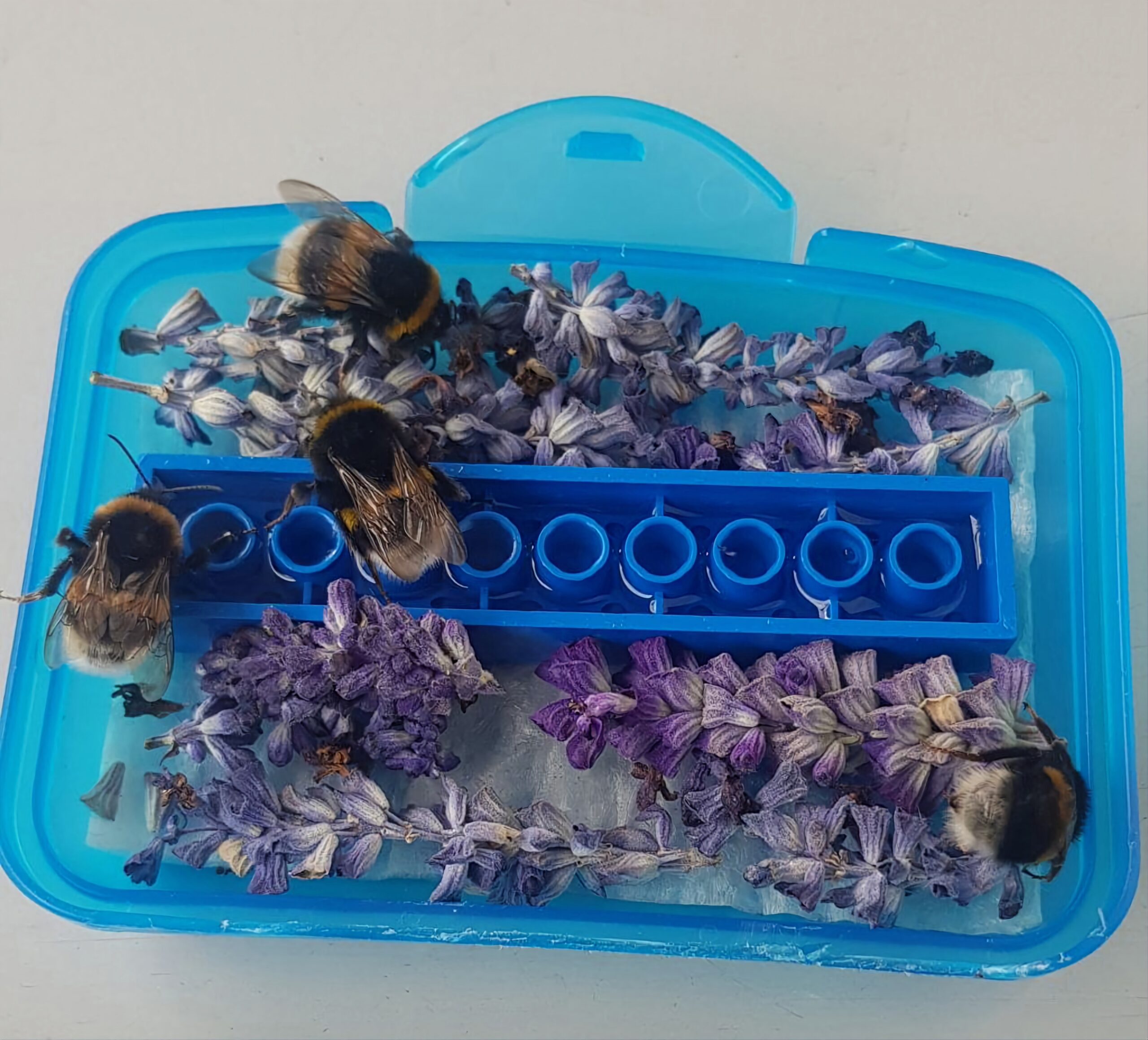 Hummeln können gut in umgedrehten Legosteinen gefüttert werden, so können sie nicht ertrinken.